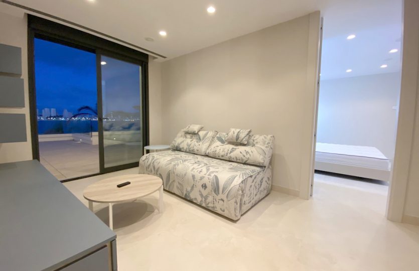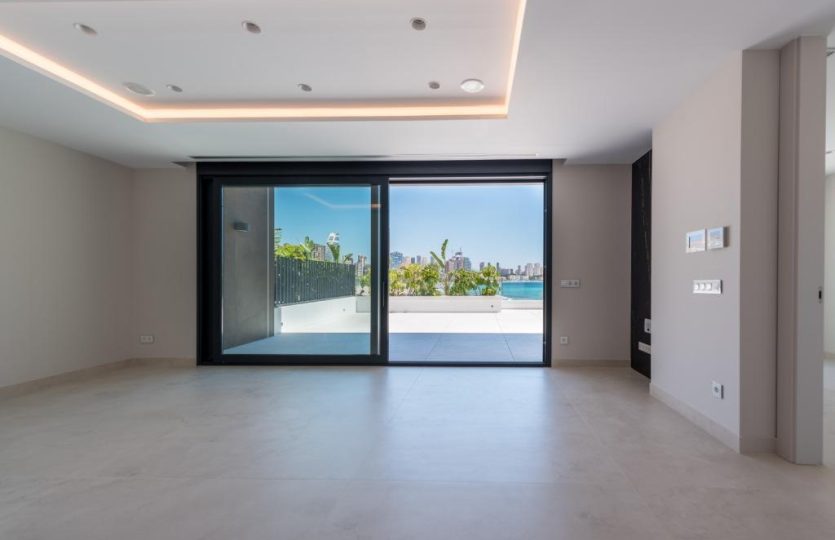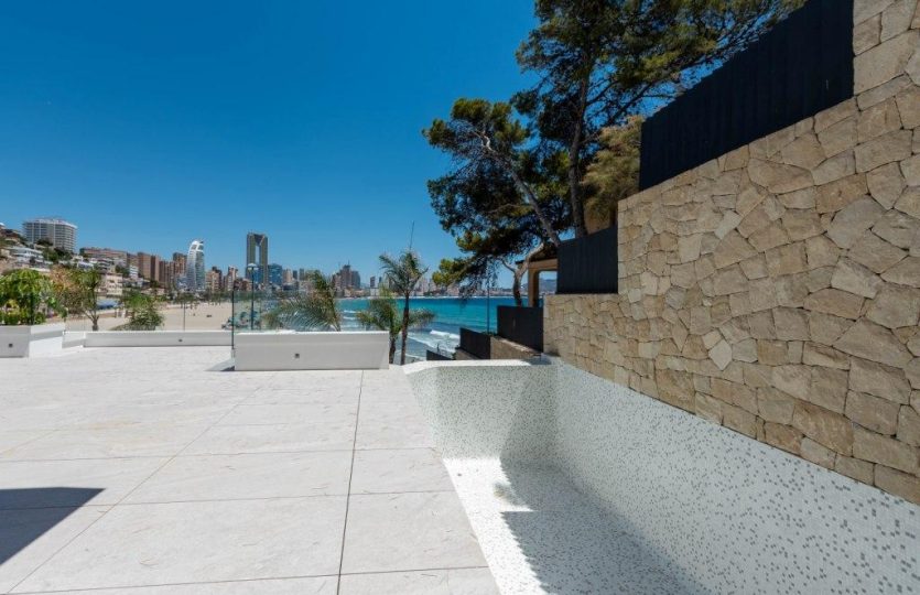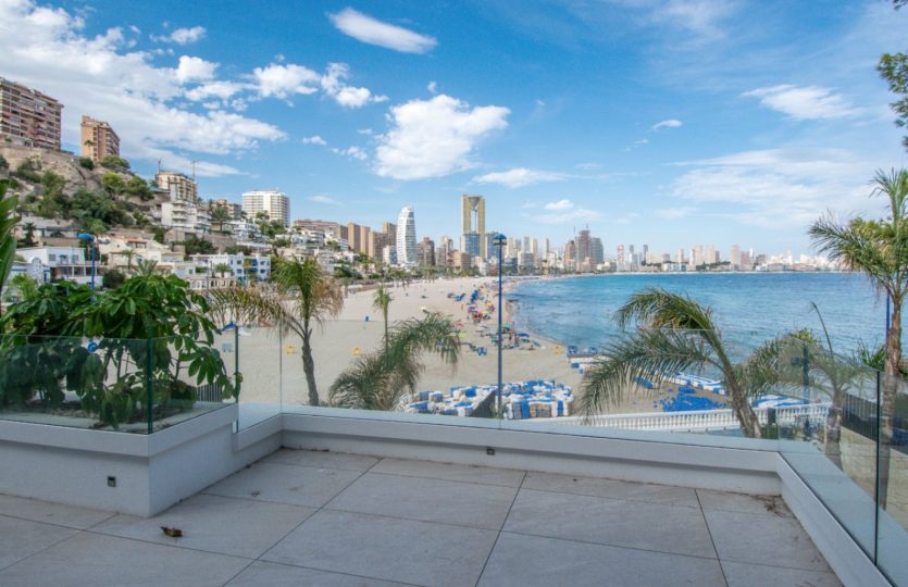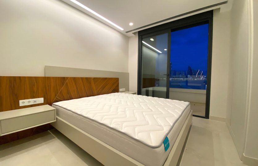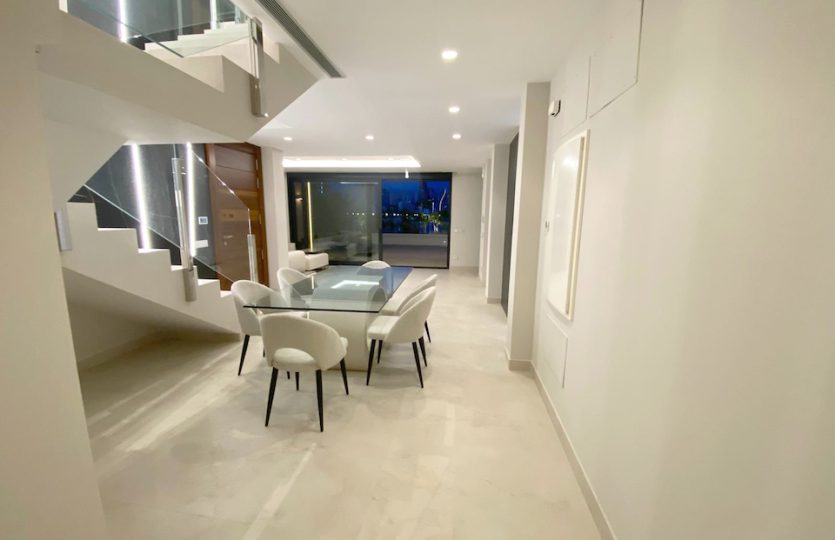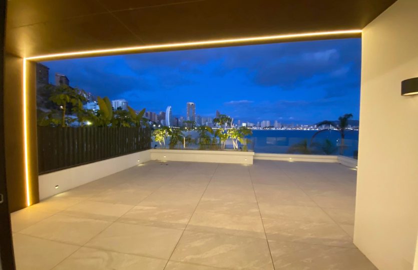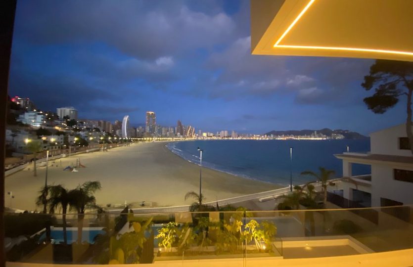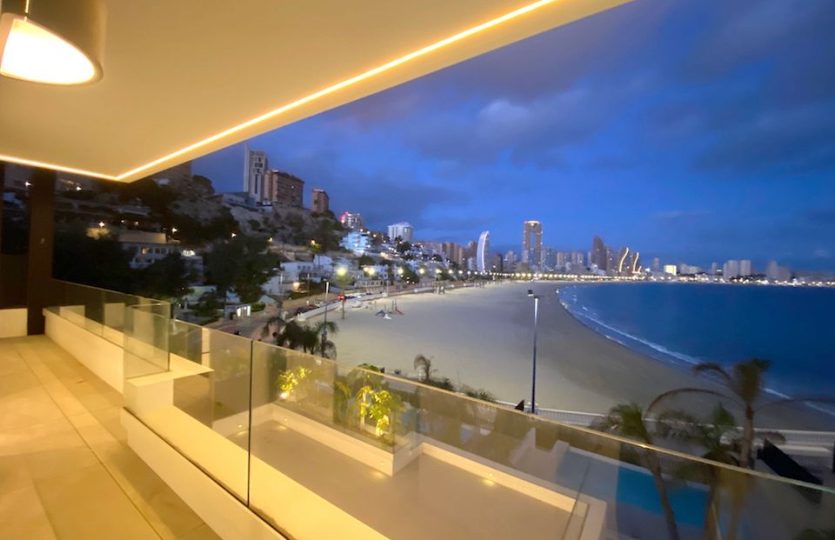 Luxe duplex appartement aan Playa de Poniente, Benidorm. Verdeeld over twee verdiepingen met 4 slaapkamers, 2 badkamers (één en suite), een gastentoilet en een aparte kantoorruimte. Open keuken met hoogwaardige apparaten. Ruime woon-eetkamer die uitkomt op een terras met een privézwembad en panoramisch uitzicht op zee. Extra’s: vloerverwarming, centrale airconditioning, geïntegreerd muzieksysteem en een privé garage voor meerdere voertuigen.