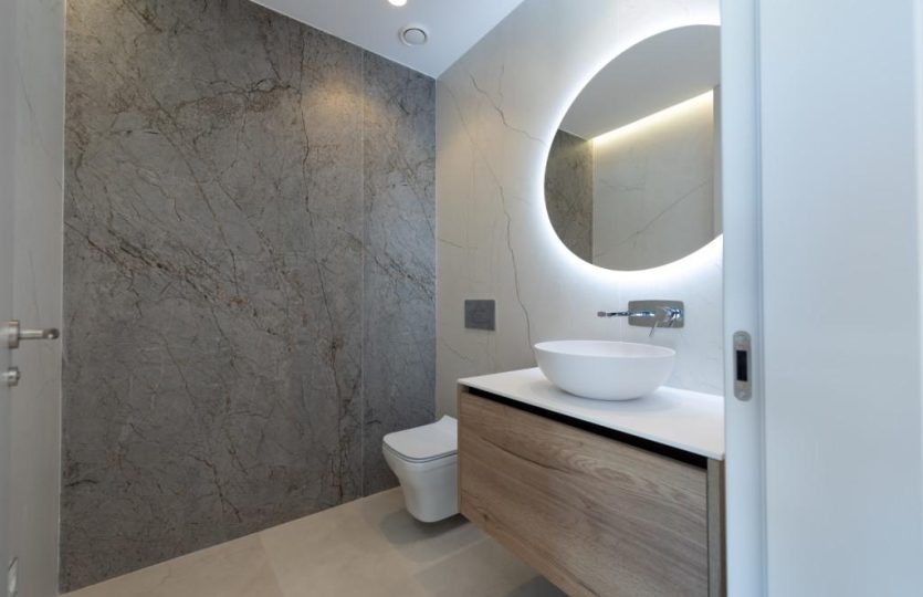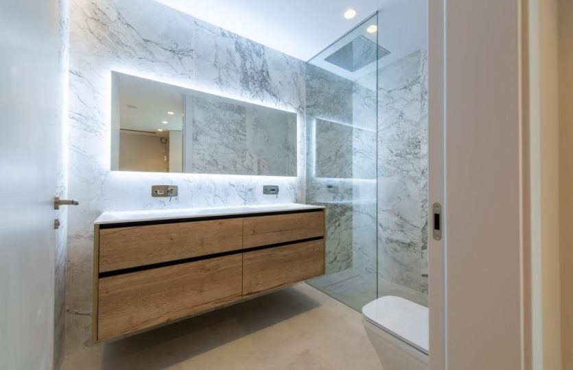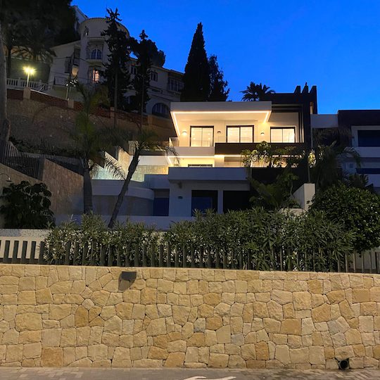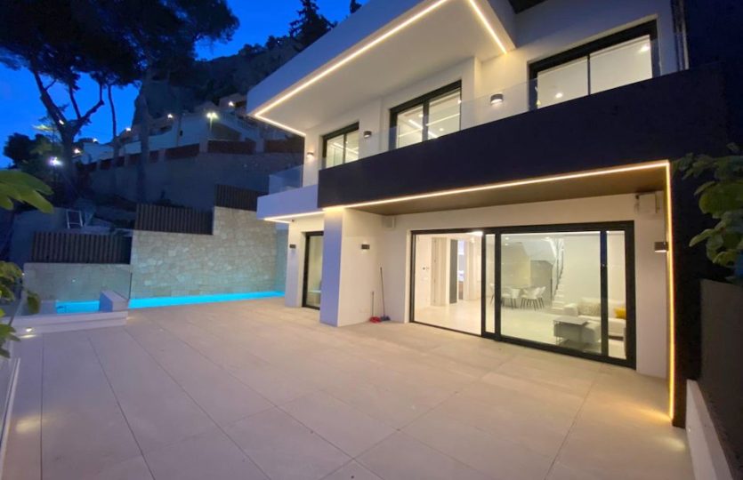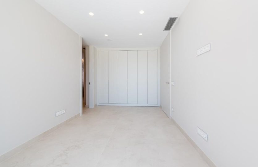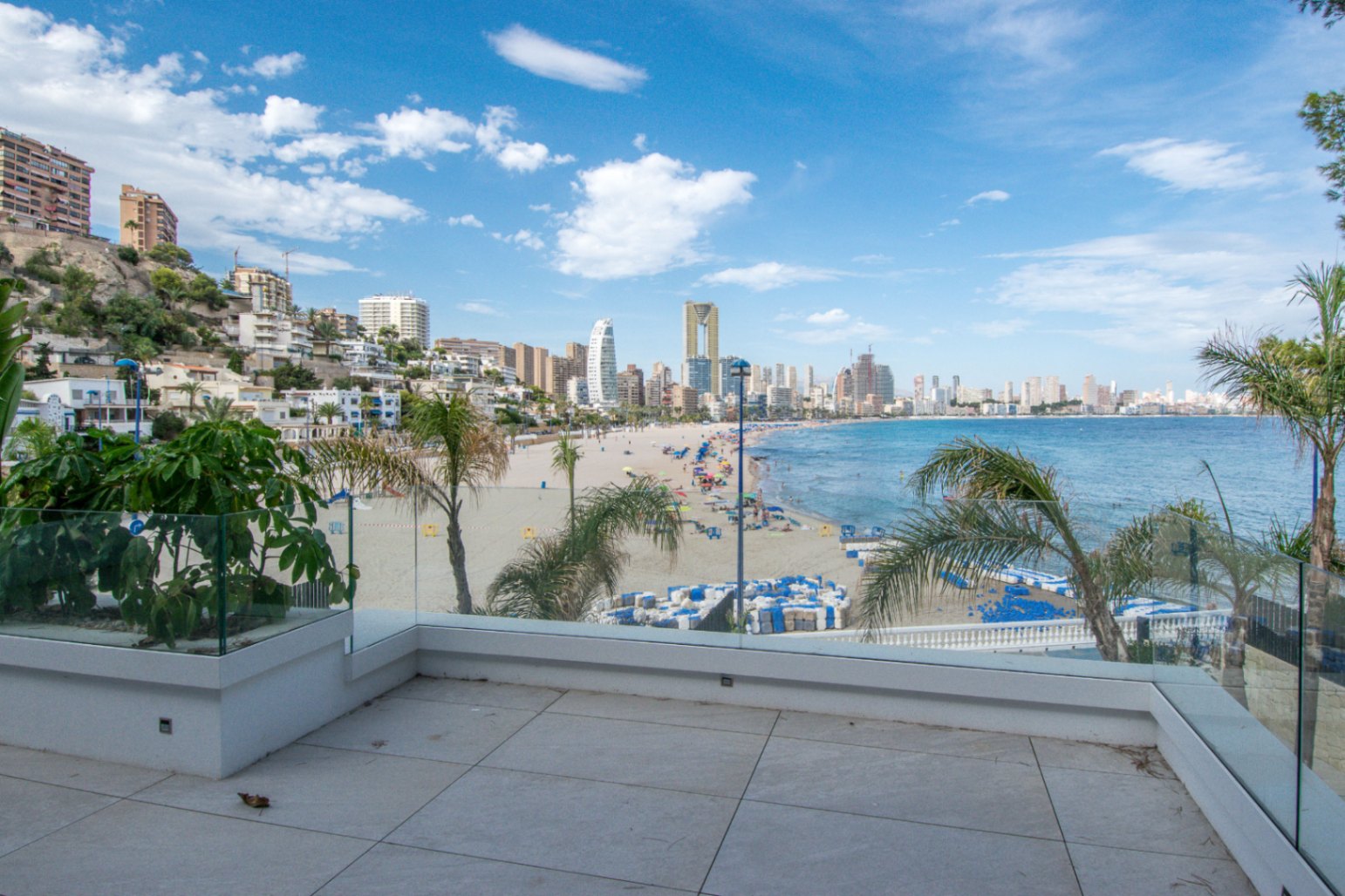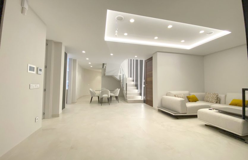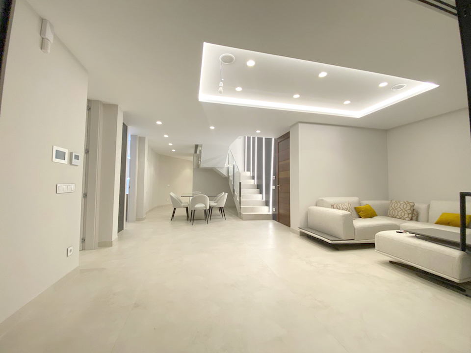 Luxe duplex appartement aan Playa de Poniente, Benidorm. Verdeeld over twee verdiepingen met 4 slaapkamers, 2 badkamers (één en suite), een gastentoilet en een aparte kantoorruimte. Open keuken met hoogwaardige apparaten. Ruime woon-eetkamer die uitkomt op een terras met een privézwembad en panoramisch uitzicht op zee. Extra’s: vloerverwarming, centrale airconditioning, geïntegreerd muzieksysteem en een privé garage voor meerdere voertuigen.