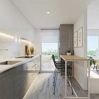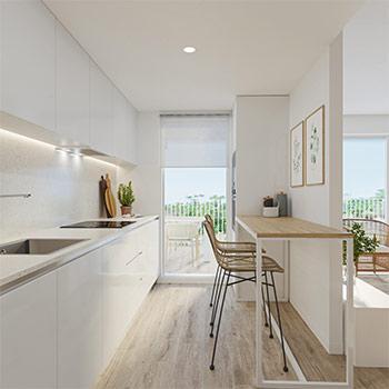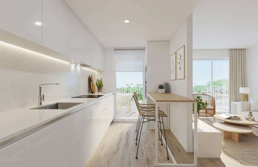 De appartementen hebben een grote woonkamer met veel ramen om natuurlijk licht te maximaliseren. Er is een geïntegreerde keuken met modern design die is voorzien van inbouwapparatuur zoals een inductiekookplaat, afzuigkap, oven en magnetron.