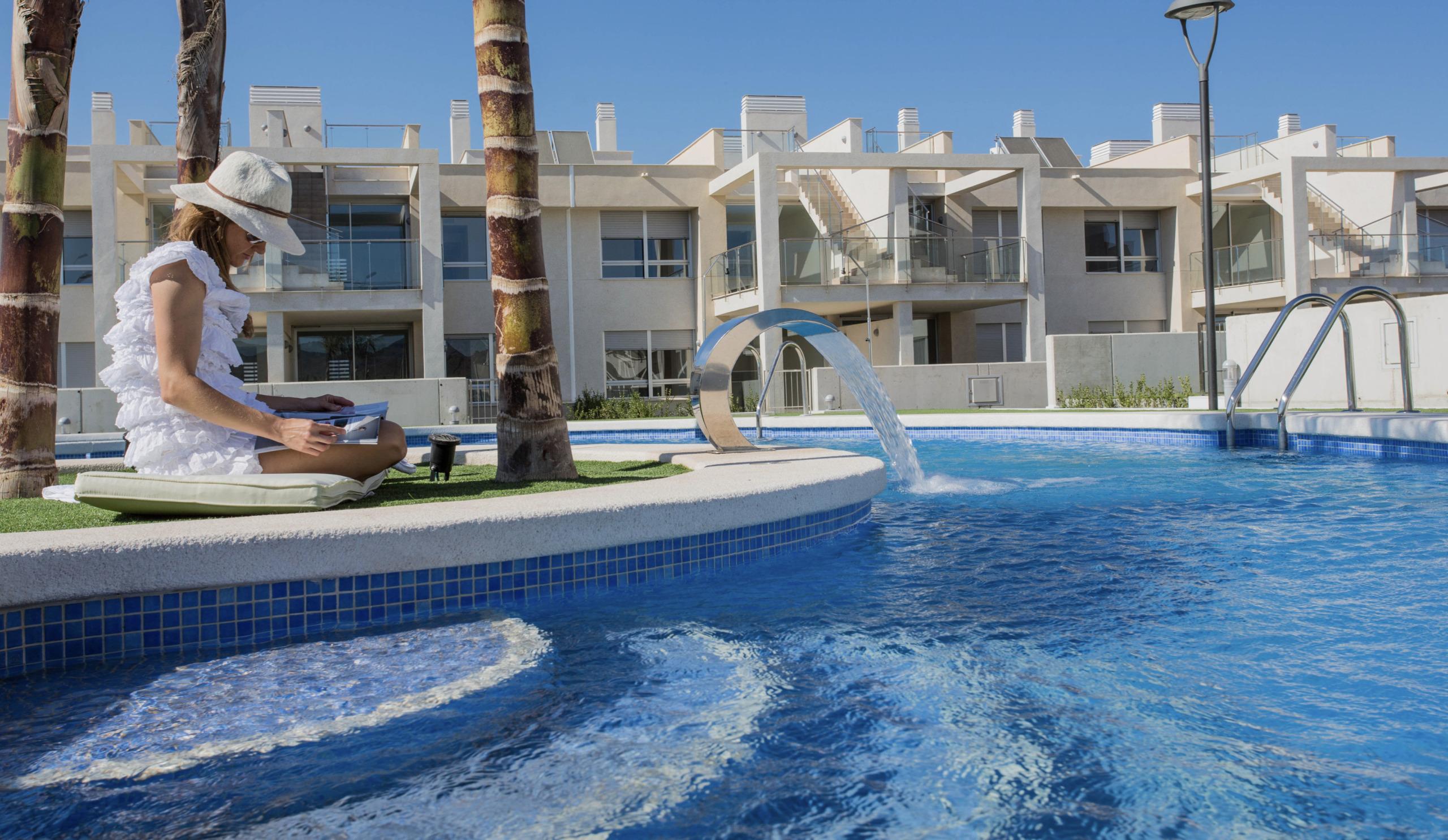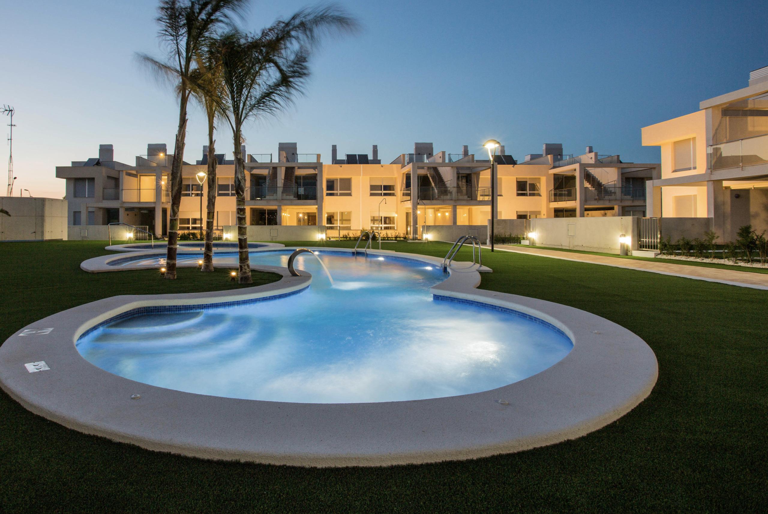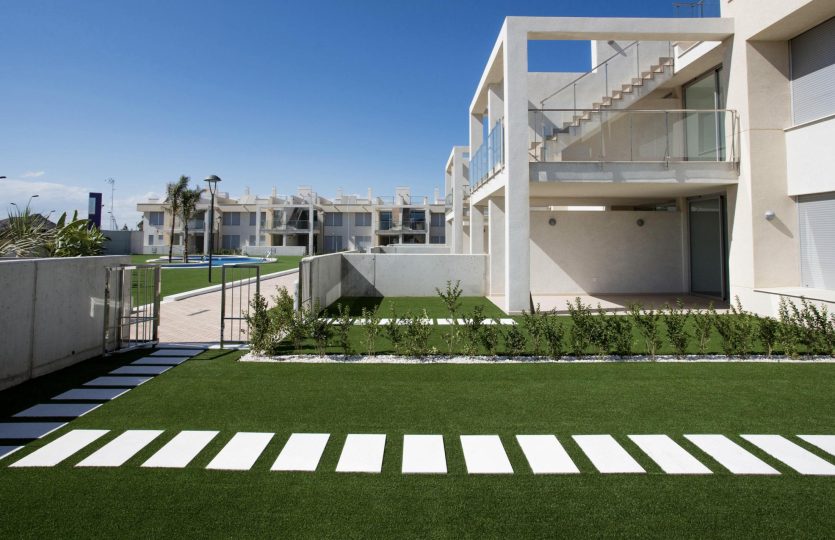 De buitenruimtes bestaan uit een groot balkon, gemeenschappelijk zwembad, tuin, privéparkeerplaats en berging.