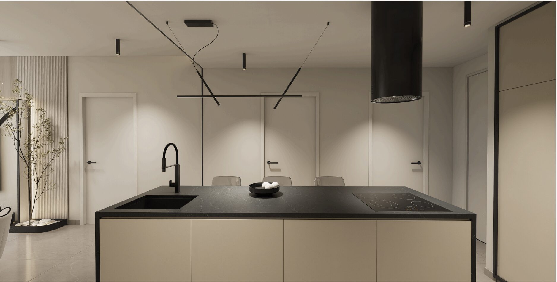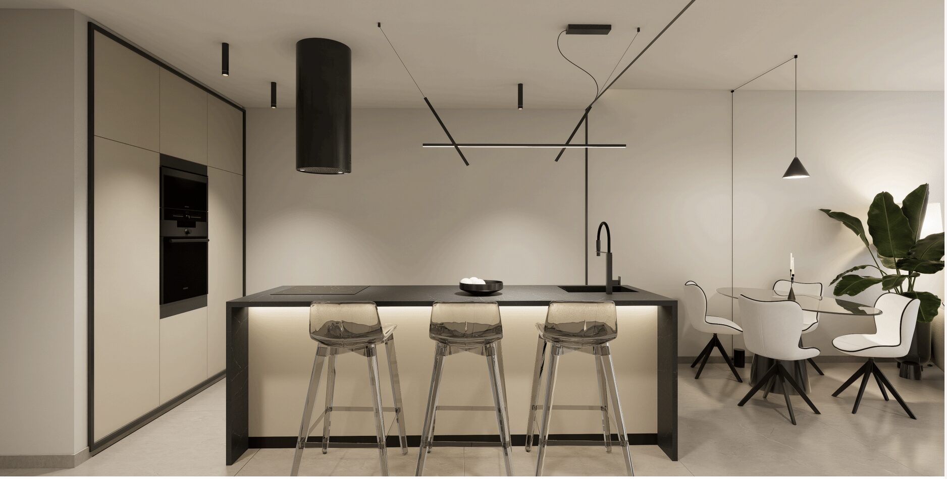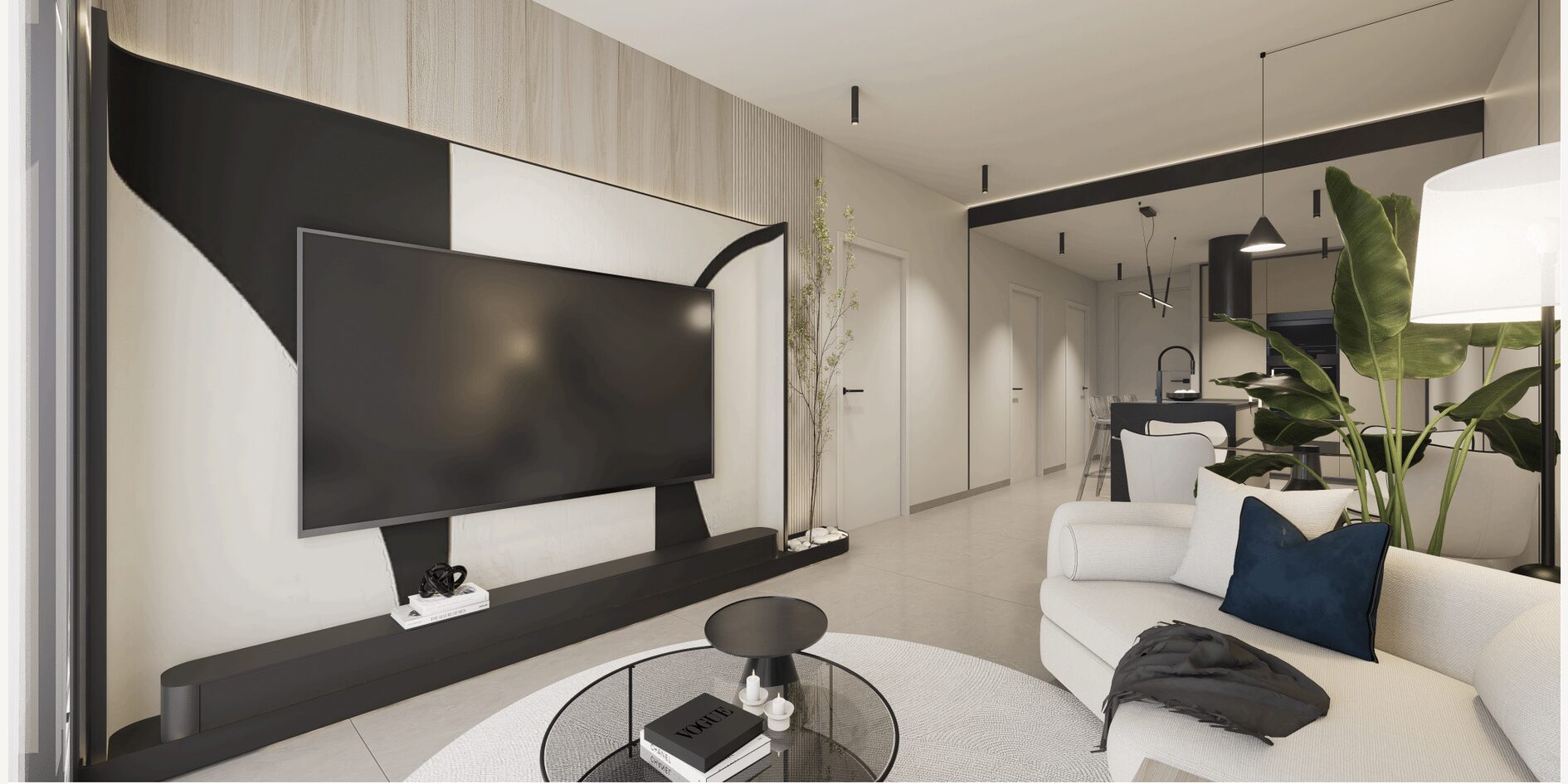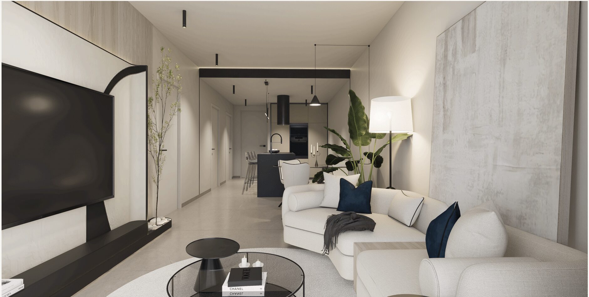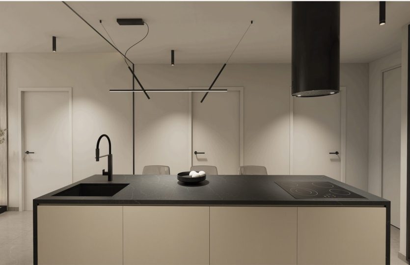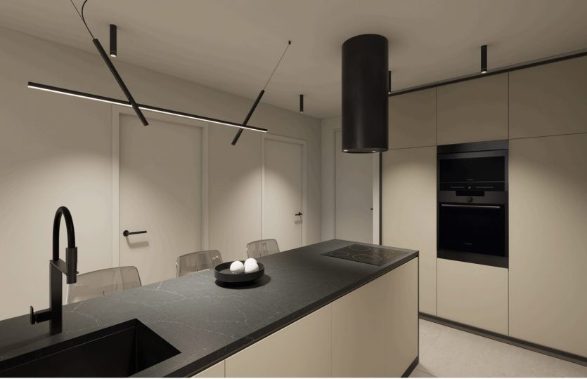 Grote woonkamer met open keuken. De keuken heeft een mooi design met ingebouwd boven- en onder keukenmeubilair.