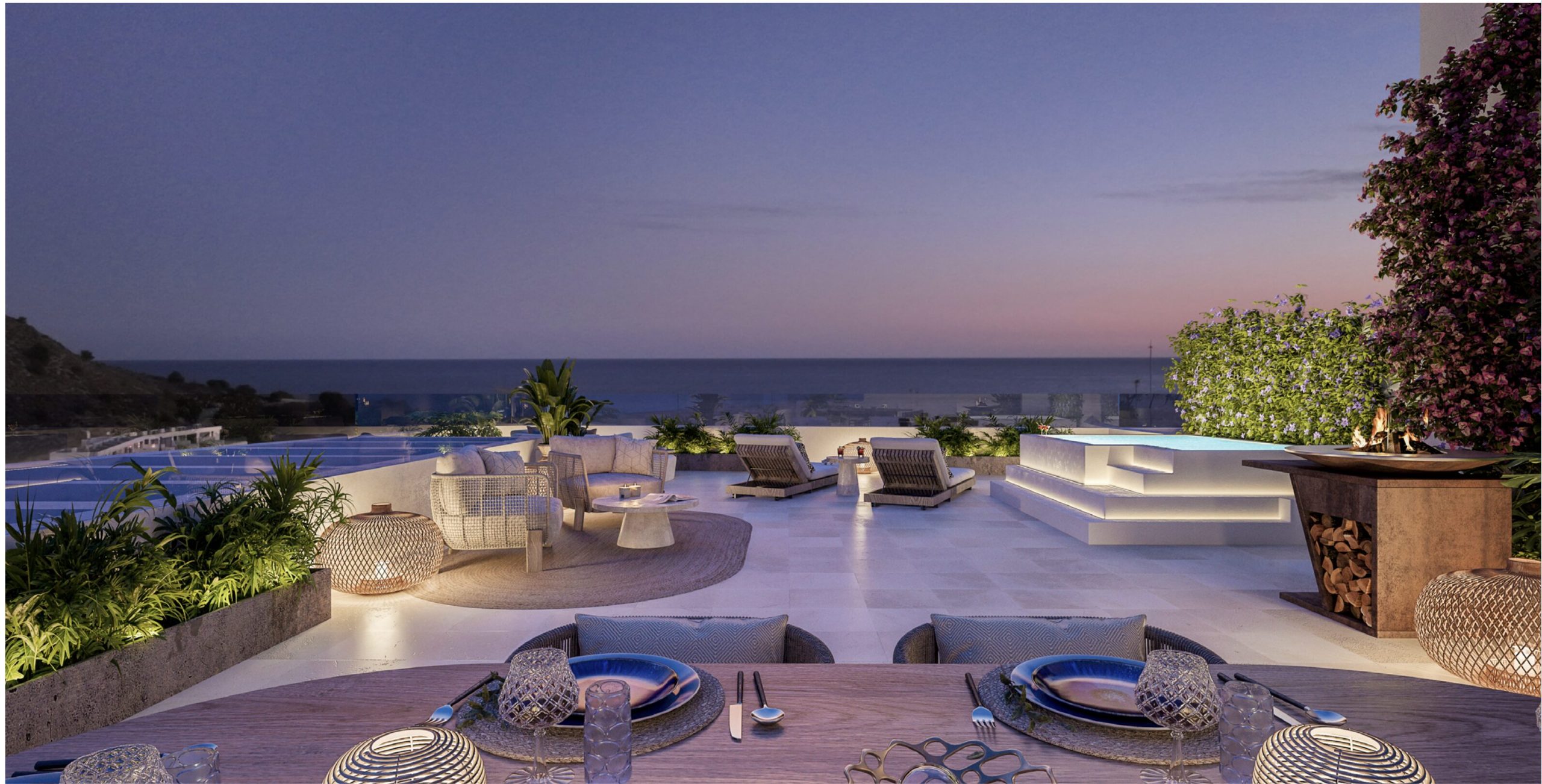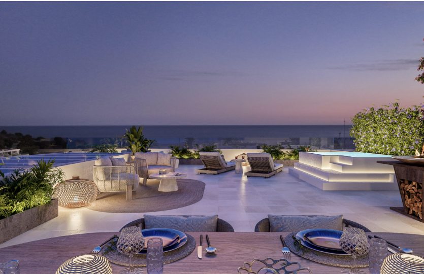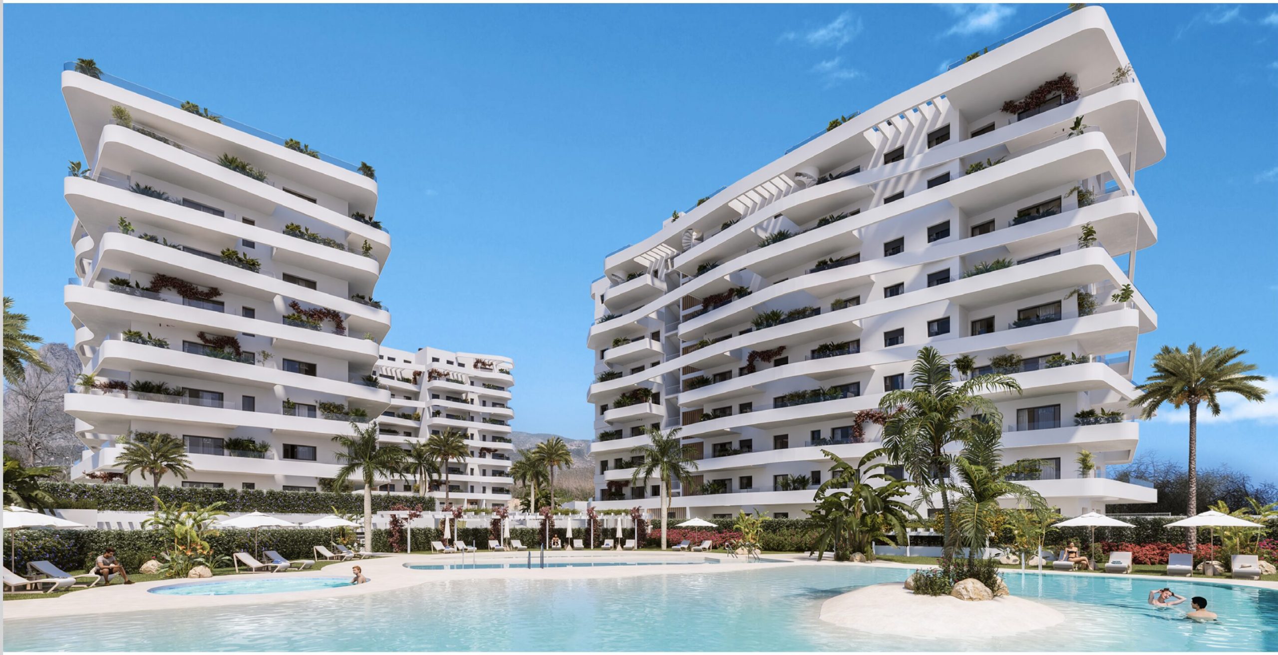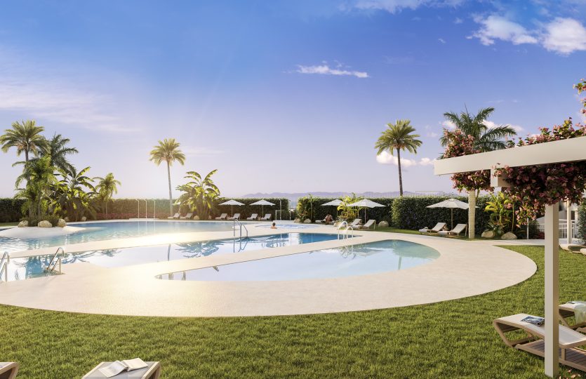 De buitenruimtes bestaan uit drie grote infinity pools, jacuzzi, barbecue zone, groene zones, fitnessruimte, minigolf, co-workingruimte en gastronomische kamer. De appartementen zijn inclusief parkeerplaats en berging.