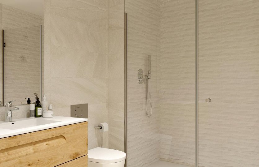 Appartementen met twee slaapkamers en twee badkamers volgens modern en elegant ontwerp. De slaapkamers zijn ruim en voorzien van moderne wit gelakte kasten. De badkamers worden compleet geleverd met wastafel, meubel, spiegel en douchescherm.