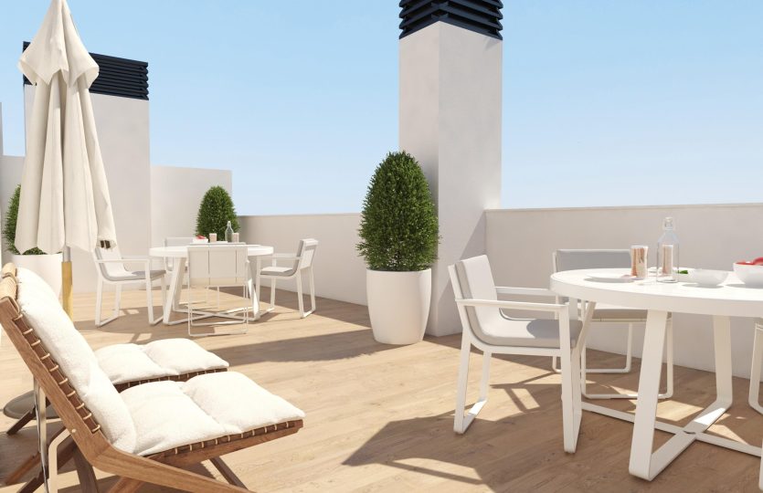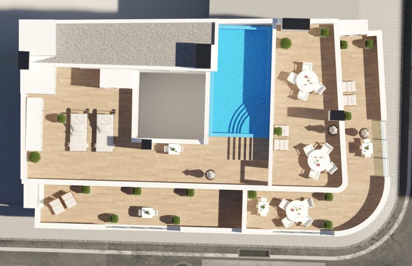 De bovenste verdieping heeft een dakterras en een groot terras om van de zonnige dagen te genieten, evenals een gemeenschappelijk zwembad. Bovendien hebben alle appartementen een balkon vanwaar u kunt genieten van het uitzicht op de stad.