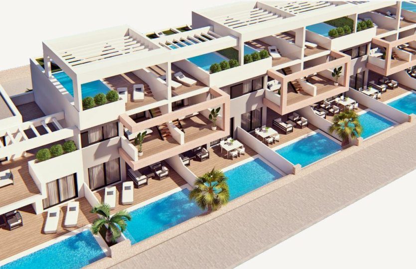 Geweldige woningen van verschillende typen: herenhuizen, geschakelde woningen of appartementen op de bovenste verdieping of begane grond met twee-drie slaapkamers en twee badkamers. Alle woningen beschikken over grote terrassen en de herenhuizen, geschakelde woningen en bovenwoningen hebben een solarium.