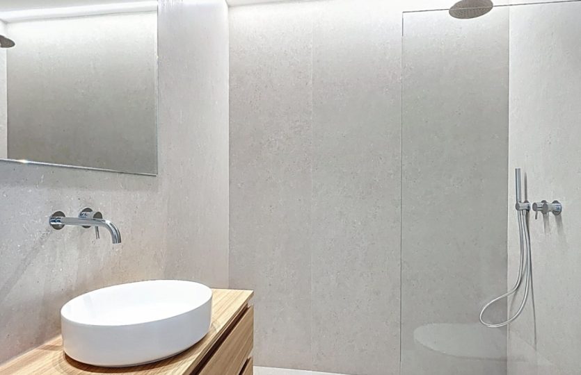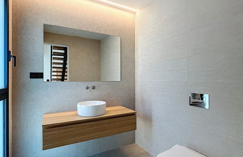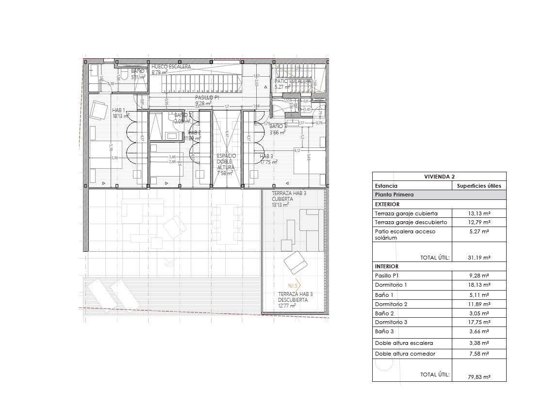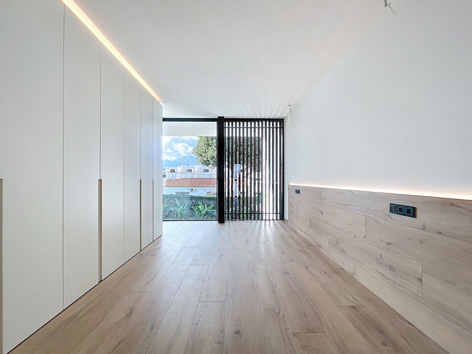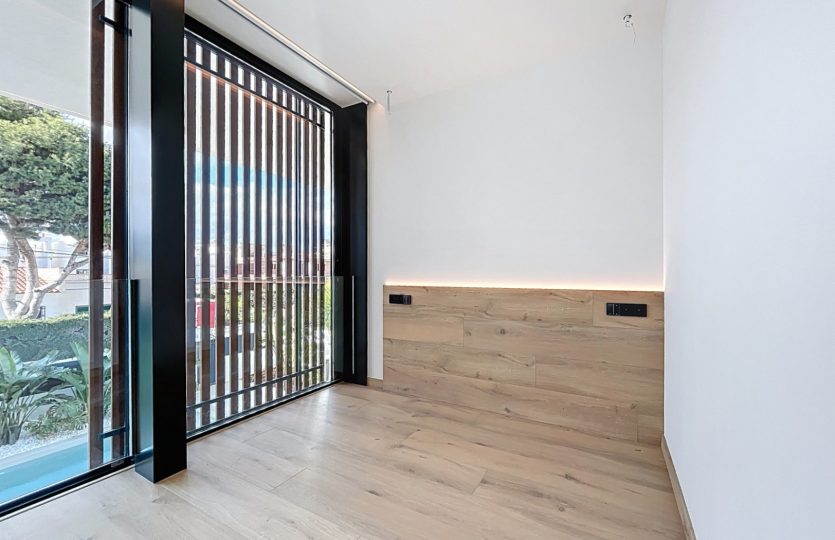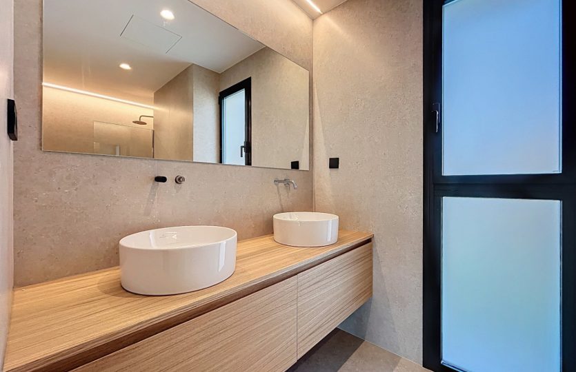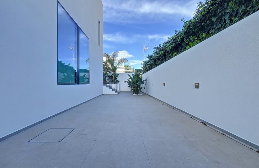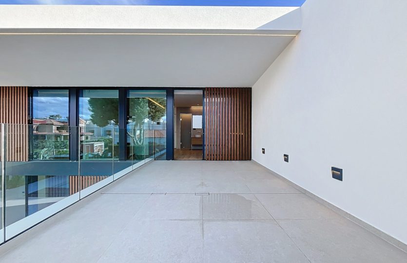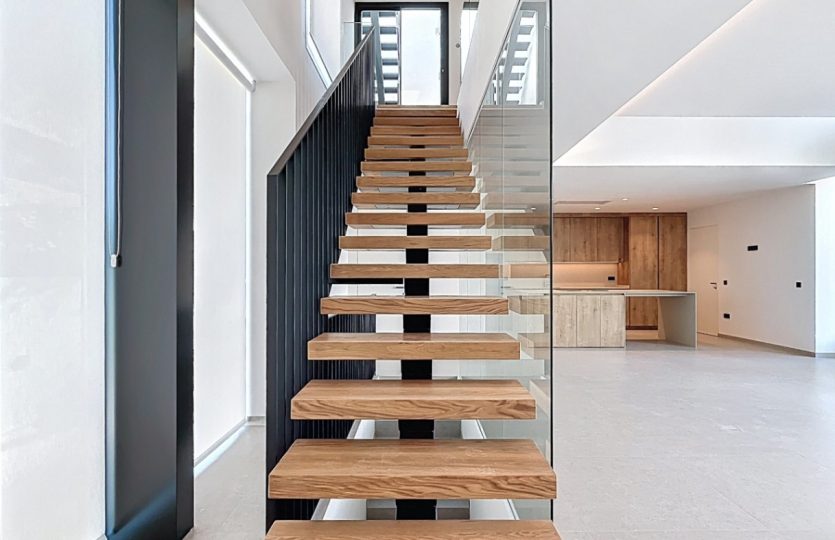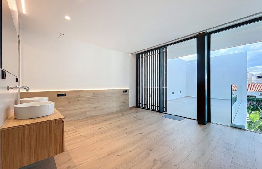 Een centrale trap leidt naar de eerste verdieping, die bestaat uit drie ruime slaapkamers (twee van 24m² en één van 15m²), elk met een en-suite badkamer en ingebouwde kasten. Het grote terras is gemakkelijk bereikbaar vanuit alle kamers. Een diensttrap biedt toegang tot een solarium op het dak van 90 m² met een prachtig uitzicht op Serra Gelada en Puig Campana.