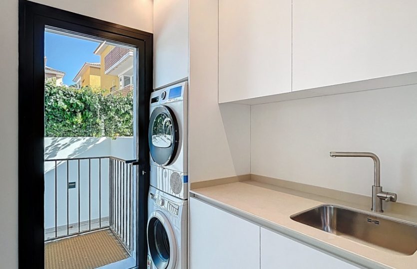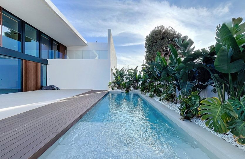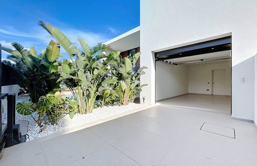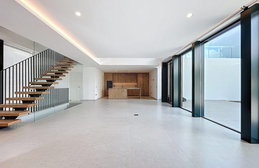 Deze moderne villa’s in Albir liggen op slechts 15 minuten lopen van het strand. Ze zijn ontworpen om het natuurlijke licht te maximaliseren en hebben een open indeling van 83 m² die de woonkamer, eetkamer en keuken naadloos met elkaar verbindt. Grote ramen leiden naar een terras op het zuidwesten met een zwembad, waardoor de doorstroming binnen en buiten wordt verbeterd. De dubbelhoge ruimte boven het eetgedeelte voegt een gevoel van openheid toe en bevordert dwarsventilatie op de hele begane grond, die ook een garage, wasruimte en een gastentoilet omvat.