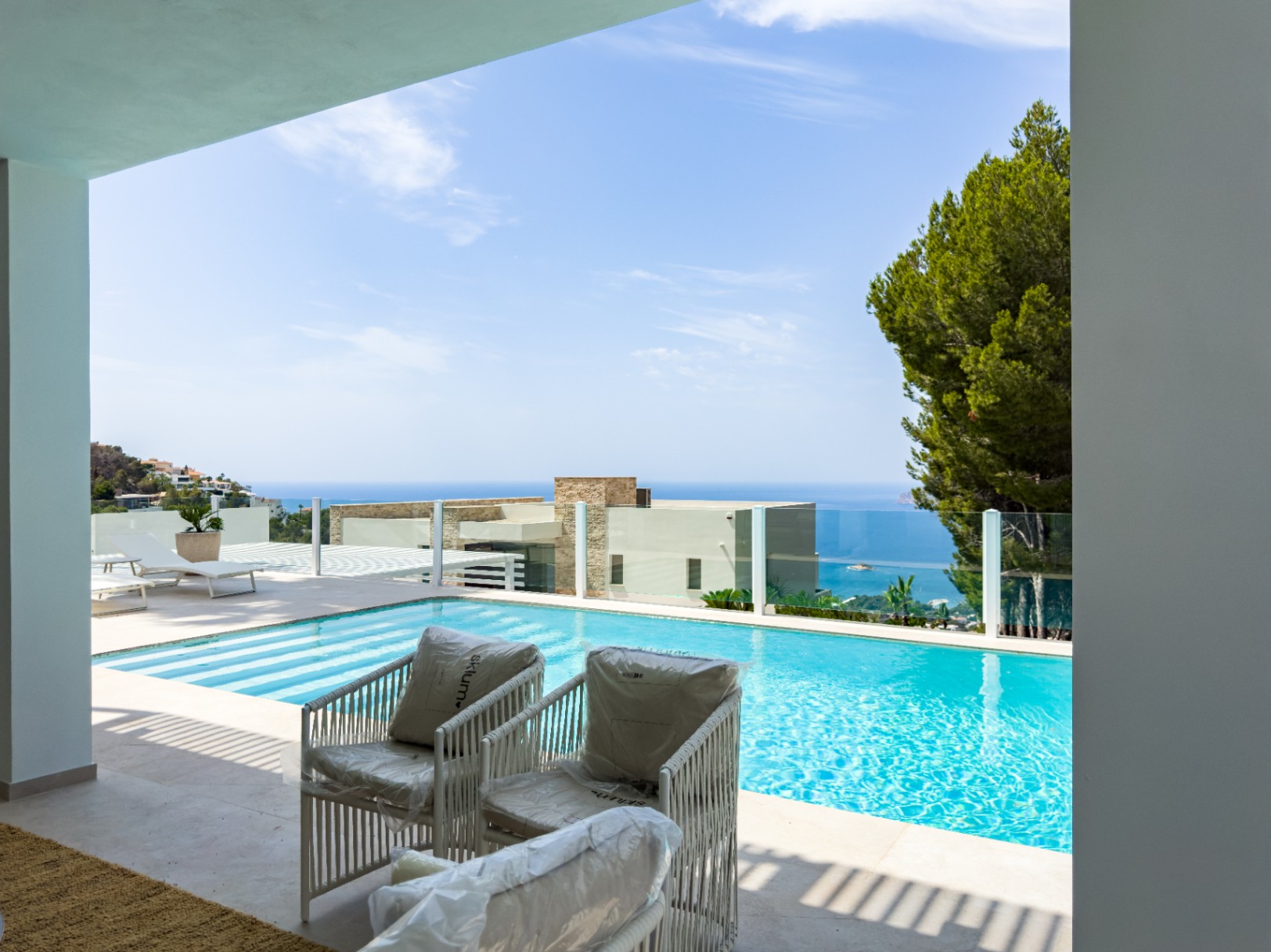Buiten vindt u een onderhoudsarme tuin met uitgestrekte terrassen die een panoramisch uitzicht op de zee bieden. Het hoogtepunt van het exterieur is het ruime zwembad, waar u kunt genieten van ontspannende momenten met een adembenemend uitzicht.